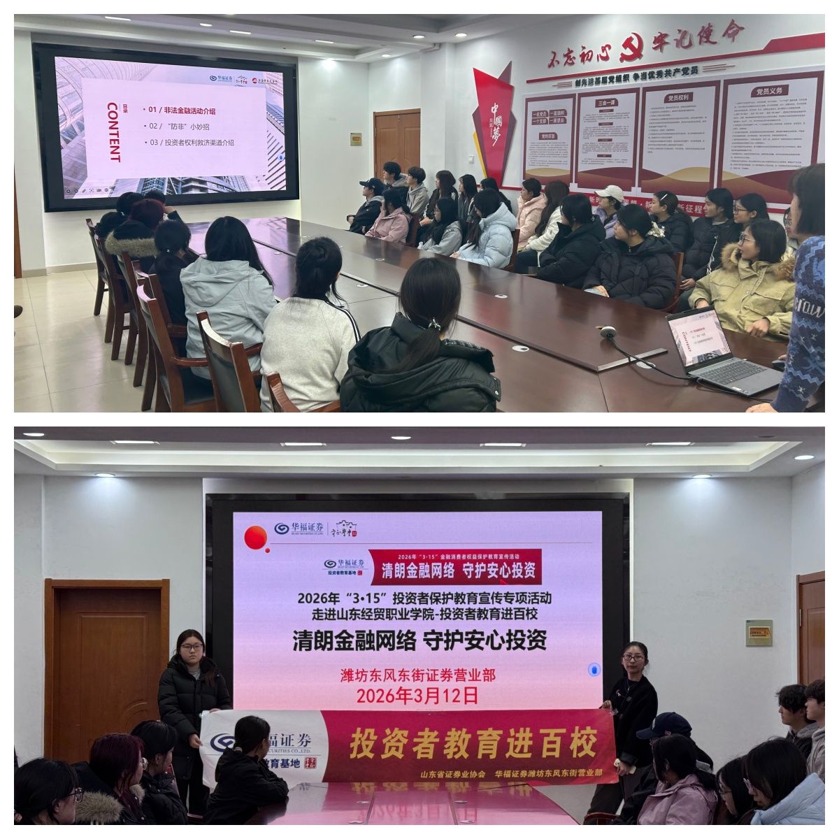 掀起一轮立体宣传,营造安全“好氛围”。结合3?15节点,邀请华福证券营业部经理刘红到9号学生公寓会议室开展“投资者教育进百校”防范金融诈骗专题讲座;依托社区公告栏、班级群、公众号等阵地,推送安全提示、张贴海报,开展知识快问快答等互动活动,构建沉浸式宣传格局。