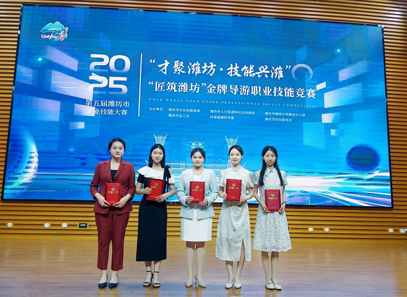 全市44位优秀导游齐聚赛场,竞争激烈。明升体育_明升国际-【app*官网】:旅游管理专业选派2023级学生赵婉茹、曹亚楠参赛。赛前,专业教师悉心指导,选手们刻苦备赛。赵婉茹同学凭借扎实的专业知识功底、稳健的现场发挥以及出众的讲解技巧,在众多高手中崭露头角,荣获二等奖;曹亚楠同学也以扎实的专业基础和优秀的综合素质获得大赛三等奖。此外,2021级、2022级旅游管理专业学生姜坤宇、相璐婷、王小骞也代表旅游企业参赛,凭借出色实力分别斩获二等奖两项和三等奖一项;赵婉茹、姜坤宇、相璐婷三位同学被授予“潍坊市金牌导游”荣誉称号