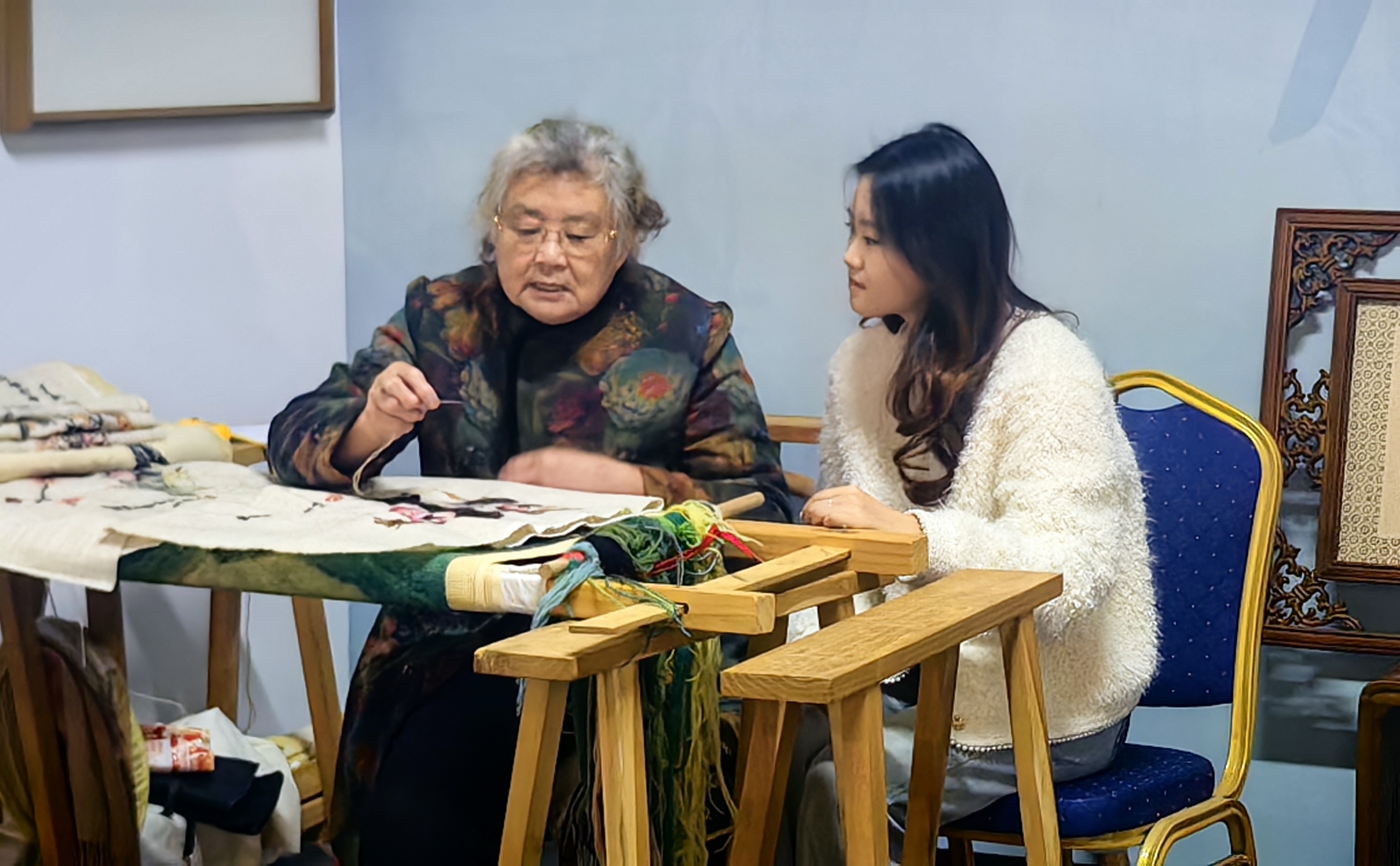 交流过程中,同学们围绕潍绣的传承现状、创新发展等话题与丁老师展开了热烈讨论。丁老师分享了她的从艺心得,鼓励年轻一代积极了解和传播优秀传统文化。随后,在丁老师的亲自指点下,同学们拿起了针线,尝试了基础的刺绣手法,切身感受了传统手工艺制作的精细与不易。
