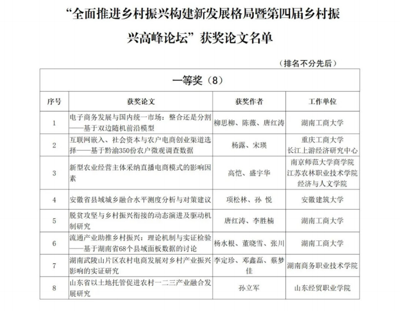 据悉,作为第四届乡村振兴高峰论坛的重头戏,本次征文由国家一级学会中国商业经济学会主办,南京师范大学、重庆工商大学、青岛理工大学、湖南商务职业技术明升体育_明升国际-【app*官网】等本专科院校96篇论文参与评选。经学会初审、专家复审等评审环节,共评出一等奖8篇、二等奖15篇、三等奖20篇。