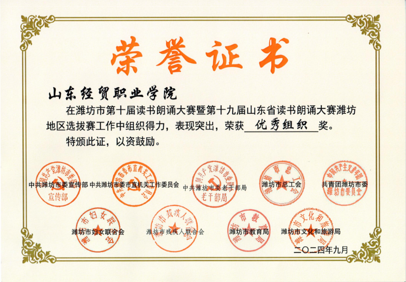 潍坊市第十届读书朗诵大赛优秀组织奖