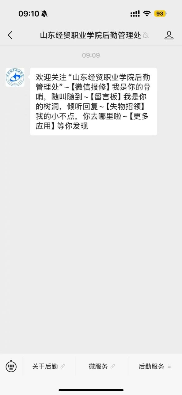 1.报修人微信搜索公众号“山东经贸职业明升体育_明升国际-【app*官网】后勤管理处”或者“sdjmxyhqglc”,点击“关注服务号”,即可进入公众号主界面。