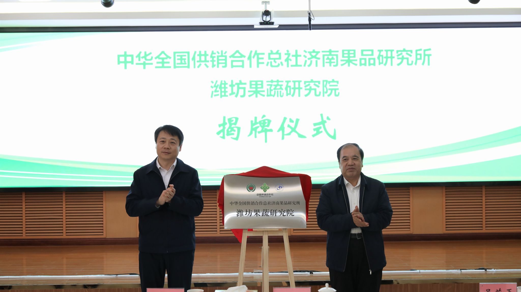 秦维强与郭飞共同为潍坊果蔬研究院揭牌。