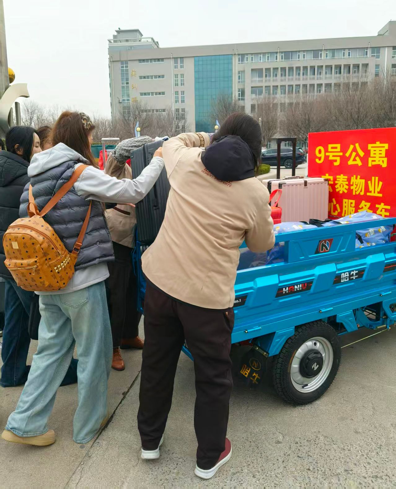 开学返校期间,物业公司工作人员驾驶着载有“爱心服务车”标识的三轮车,穿梭在校园入口、主干道与学生宿舍之间,往返奔波、不辞辛劳。针对学生携带被褥、书籍、生活用品等大件行李较多的特点,工作人员提前划定接送路线、明确停靠点位,在校园入口设立服务岗,主动上前对接返校学子,热情帮忙搬运行李、细心摆放整齐,耐心询问宿舍地址,确保行李精准、安全送达。