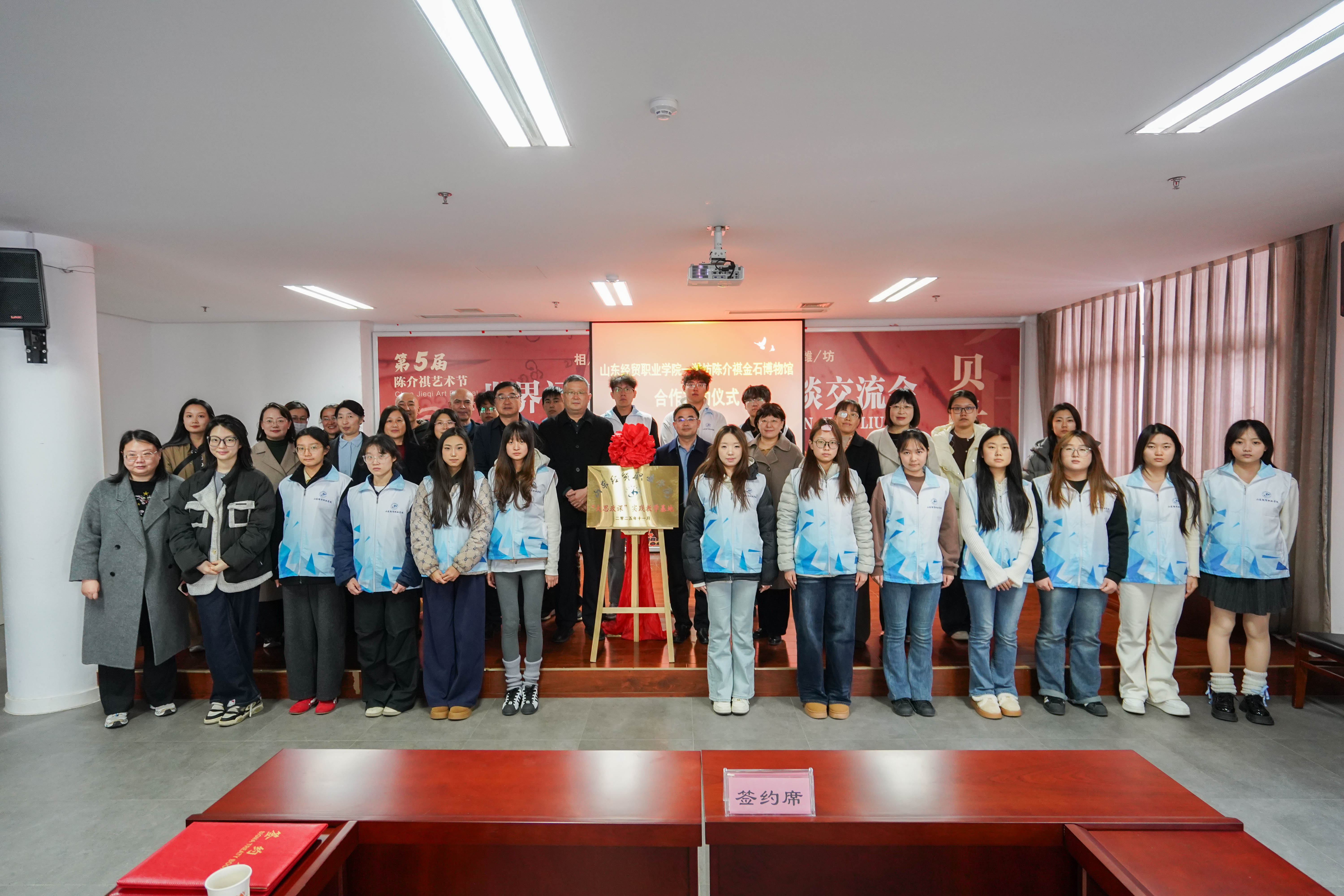 李海娜与陶琦签署馆校战略合作框架协议,刘涛与赵继民为“山东经贸职业明升体育_明升国际-【app*官网】大思政课实践教学基地”揭牌。