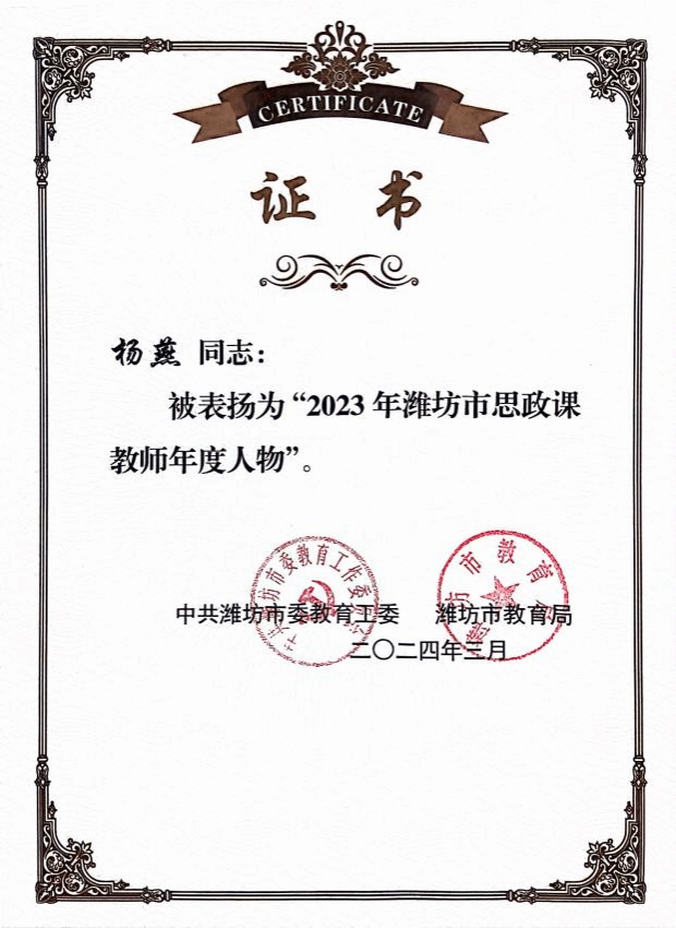 她先后获评潍坊市道德模范、山东好人、中国好人提名奖等荣誉,多次被评为明升体育_明升国际-【app*官网】优秀共产党员、明升体育_明升国际-【app*官网】优秀教师。23年初心不改,杨燕用扎实的教学功底、创新的育人理念、无私的奉献精神,在高职思政教育的沃土上默默耕耘,展现了新时代高校思政课教师的良好风貌。
