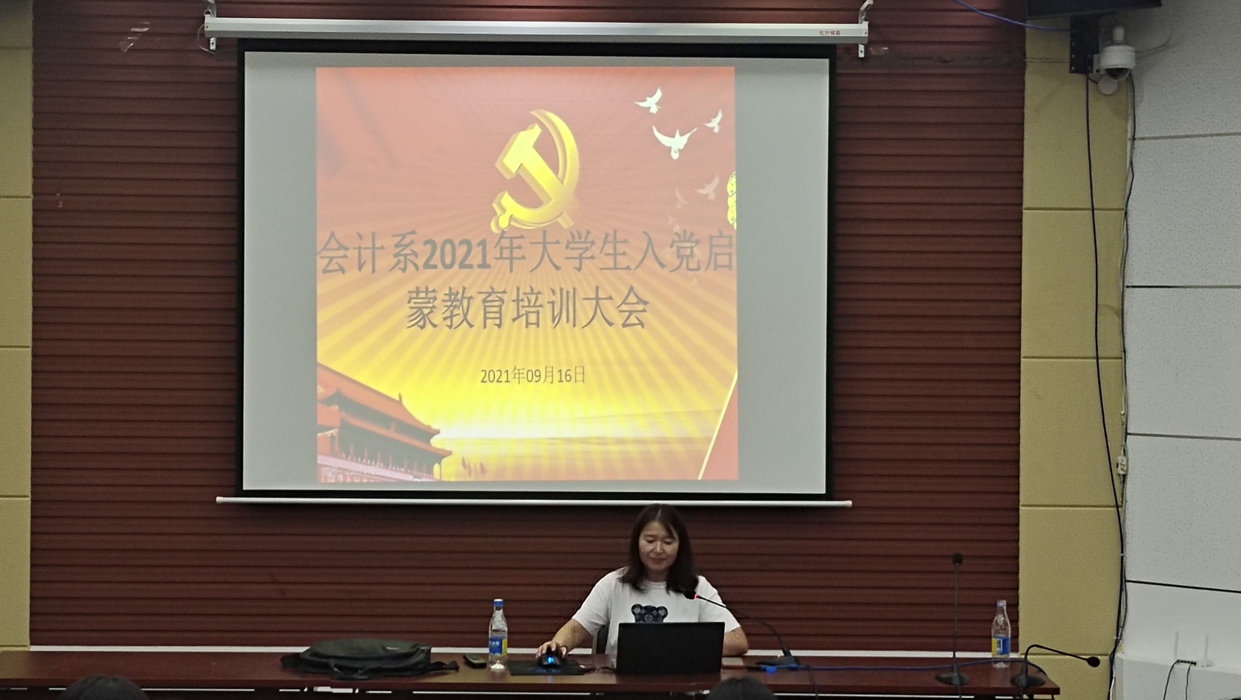 9月16日下午,会计系在122多功能厅举办了2021年大学生入党启蒙教育培训大会。会计系学工党支部组织委员王新秀为新生进行了入党启蒙教育第一讲。