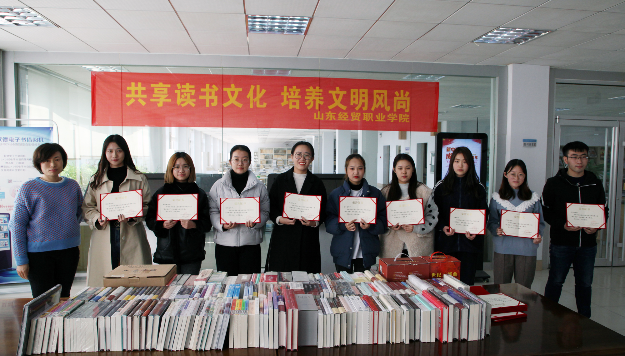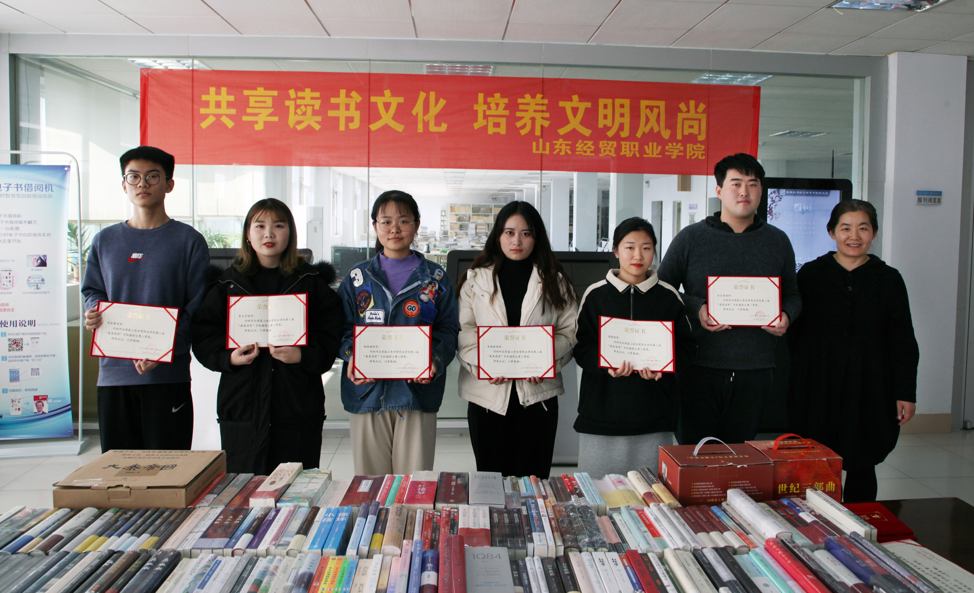 11月14日,山东经贸职业明升体育_明升国际-【app*官网】第二届“最美读者”手机摄影大赛颁奖典礼在图书馆六楼阅览室举行,图书馆副馆长臧伟、科学与人文系艺术教研室李霞,邓明灿、图书馆王凯、王国丽共同为获奖选手颁发了证书及奖品。