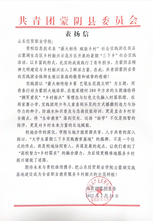 近日,共青团蒙阴县委员会专程致信,高度赞扬我系“薪火相传 赋能乡村”实践队在2025年暑期“三下乡”活动中的突出表现。来信充分肯定了实践队通过主题墙绘、安全教育等多元形式,有效助力蒙阴县云蒙湖生态区乡风文明建设和乡村振兴发展,展现了新时代青年的责任担当与专业素养。