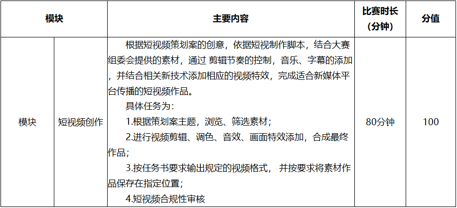 竞赛内容为短视频创作模块,综合考察选手主题提炼能力和创作能力。选手根据主题完成短视频创作的策划、剪辑和合成。
